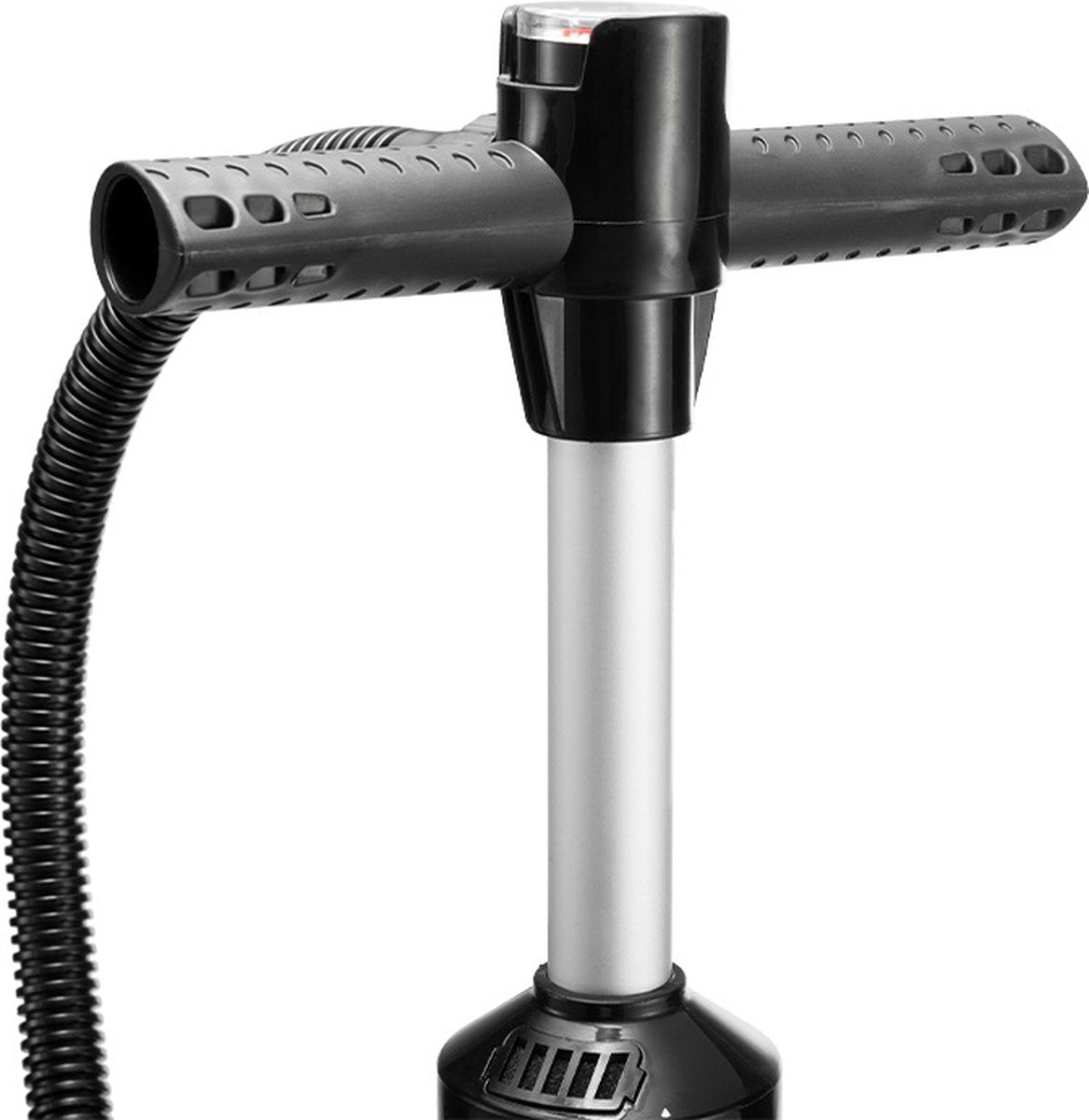 Met deze handpomp met drukmeter kun je altijd vertrouwen op de juiste luchttoevoer. De geïntegreerde manometer zorgt ervoor dat je precies weet hoeveel druk er in je banden of andere opblaasbare items zit. Dit maakt het oppompen niet alleen eenvoudiger, maar ook veiliger.